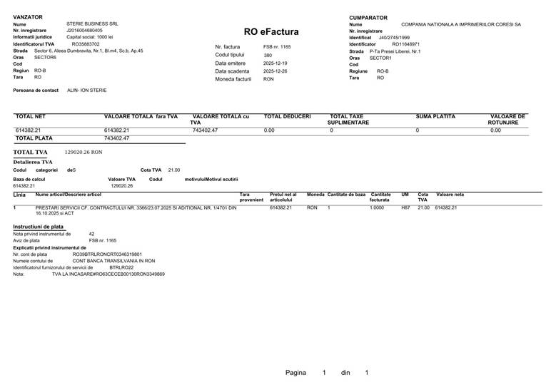 Mai mult, apare o plată uriașă, de 743.402,47 RON (aproximativ 150.000 Euro), către Sterie Business SRL, efectuată rapid, într-o singură tranșă. Descrierea facturii este lacunară: „Prestări servicii cf. contractului”. Această grabă de a plăti sume imense unor SRL-uri, chiar sub ochii corpului de control, sugerează o încercare disperată de a goli conturile înainte ca neregulile să fie stopate oficial.