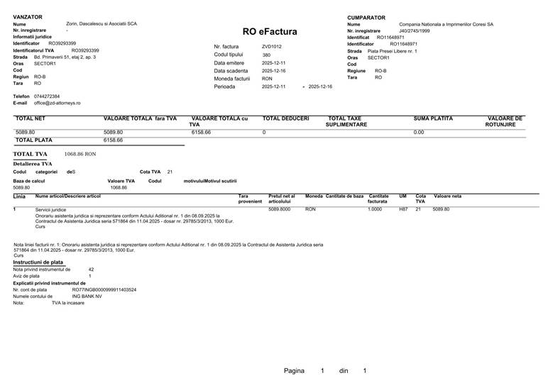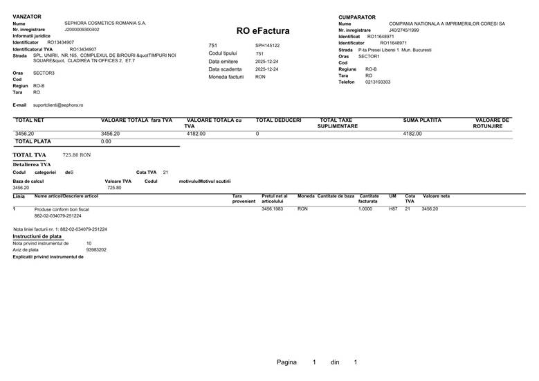 Dar „protocolul” nu se oprește la băutură. O altă factură, emisă de Sephora Cosmetics România, arată o plată de 4.182 RON din conturile Coresi. Patru mii de lei pe produse cosmetice și parfumuri! Este greu de imaginat cum justifică administratorul special achiziția de rujuri, fonduri de ten sau parfumuri de lux în contabilitatea unei imprimerii naționale. Acesta este un exemplu clasic de folosire a creditului societății în scopuri contrare intereselor acesteia, o faptă cu iz penal evident.