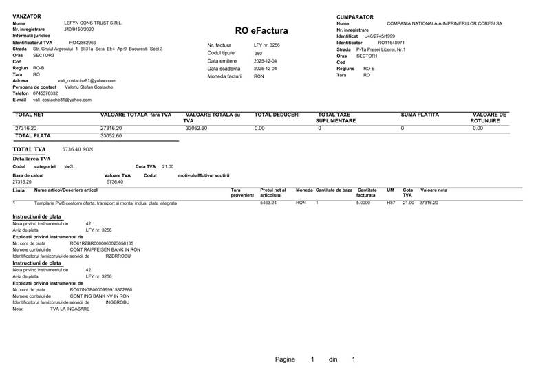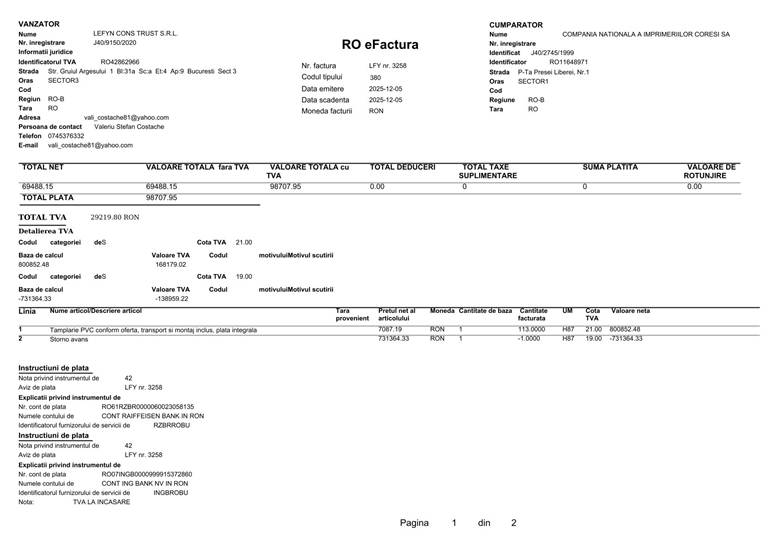 Sub mandatul dublu al lui Irimie Gabriel Băcăințan, CNI Coresi a virat sume colosale către firma Lefyn Cons Trust S.R.L.. Facturile indică plăți de aproape 100.000 RON pentru „tâmplărie PVC”. În plin proces de insolvență sau reorganizare, prioritatea directorului general a fost schimbarea geamurilor? Sau avem de-a face cu o achiziție supraevaluată, menită să direcționeze lichiditățile companiei către firme prietene?