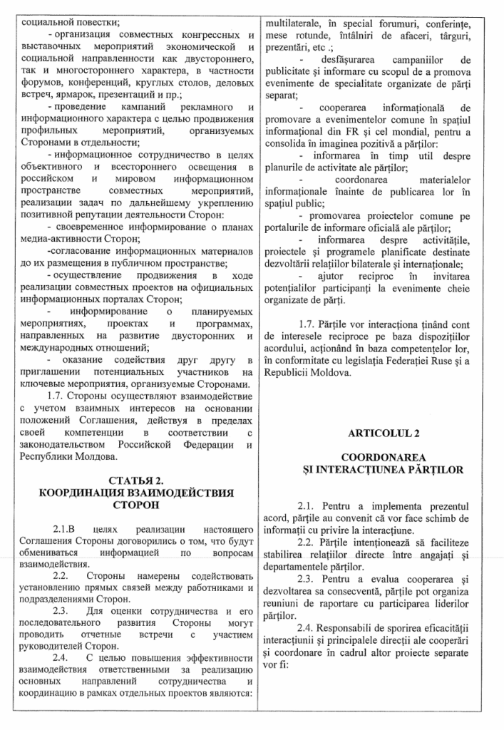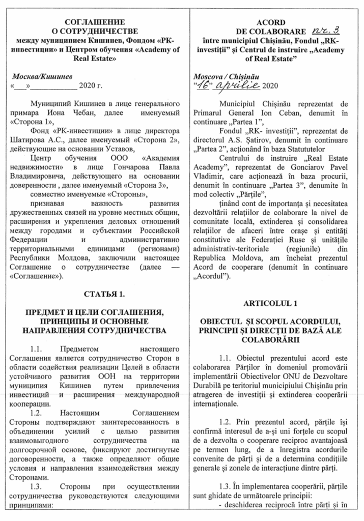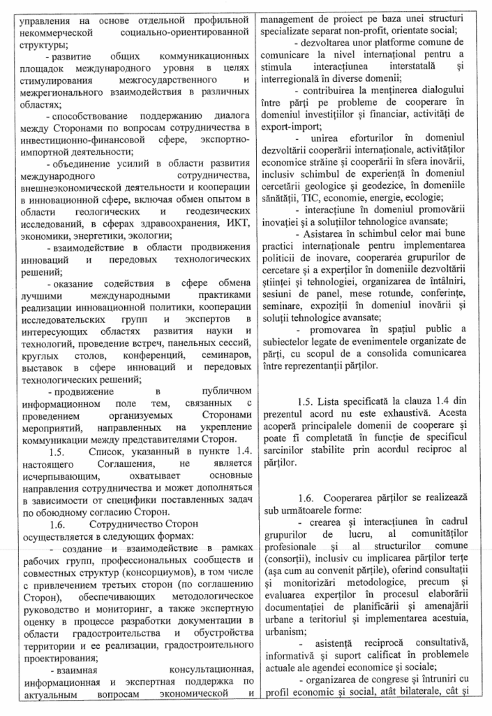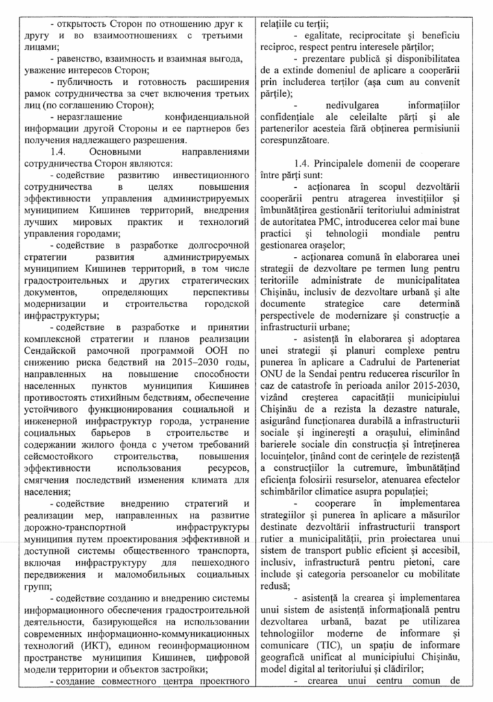 Acest document nu a fost o simplă formalitate protocolară, ci prevedea clauze ce pun în pericol securitatea națională și autonomia locală, incluzând schimbul de informații sensibile și implicarea partenerilor ruși în elaborarea documentelor strategice, inclusiv a Planului Urbanistic General al municipiului Chișinău. Astfel, în timp ce România plătea pentru fațade, dezvoltarea profundă a Chișinăului risca să fie desenată după hărțile și interesele Moscovei.