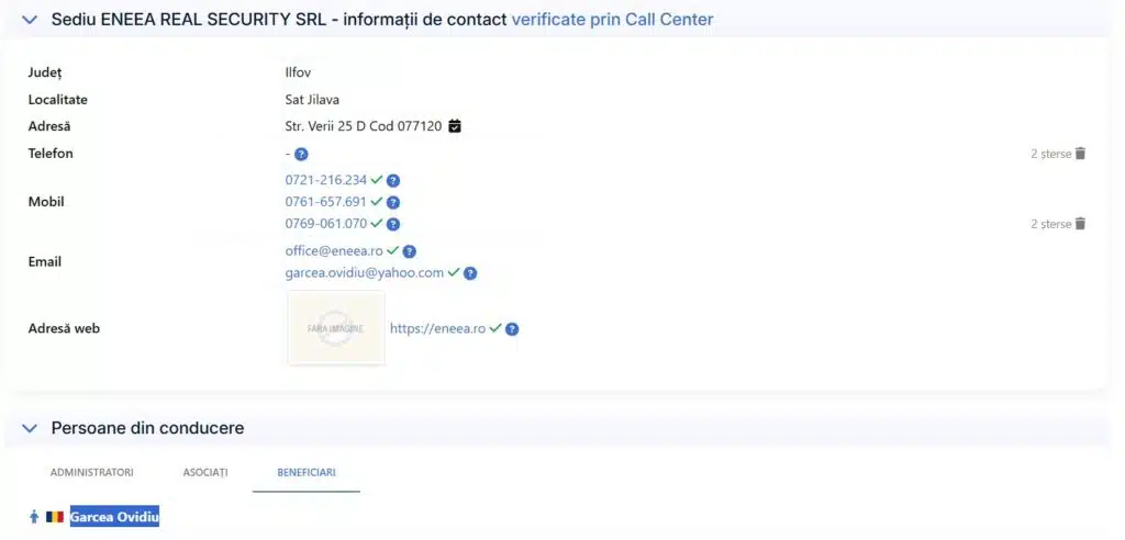 Pe site-ul SEAP, la rubrica „Website firmă”, Eneea Real Security a trecut adresa „www.a.ro”. Pe propriul site, eneea.ro, firma își listează printre clienți Muzeul Național al Hărților, Carrefour Vitan și Centrul Național al Cinematografiei — în cazul din urmă, o contestație depusă de Eneea la CNSC în 2024 arată că relația nu a fost tocmai lipsită de tensiuni. Între timp, un fost comisar din Jilava încasează milioane din paza școlilor, a terenurilor de sport și a gropilor de gunoi din comunele PNL ale sudului Ilfovului.