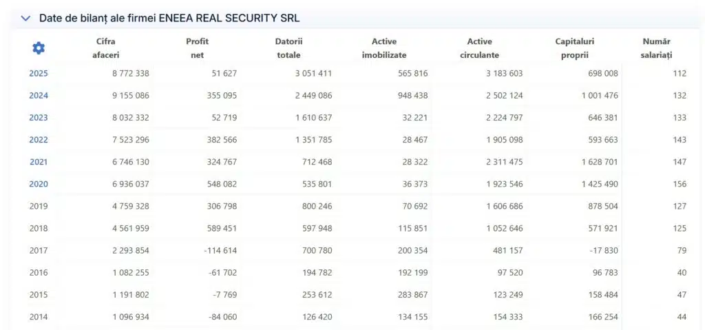 În anul fiscal 2025, firma a raportat o cifră de afaceri de 8.772.338 RON, dar un profit net de doar 51.627 RON — o marjă de sub 0,6%. Între timp, datoriile companiei au crescut cu 25%, ajungând la 3.051.411 RON. Înființată în 2009, firma a ajuns la 132 de angajați în 2024.